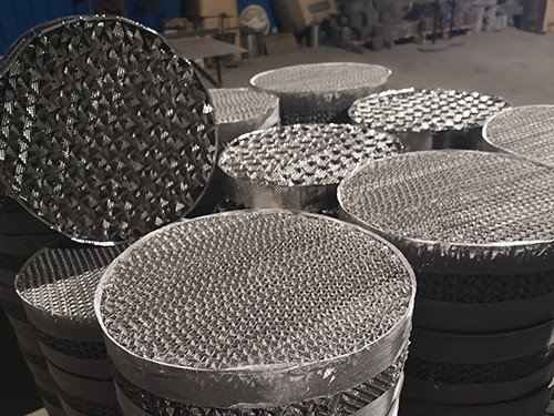 丝网波纹填料是波纹填料的主要形式之一,它是由若干压成波纹的丝网片平行直列组成, 波纹片倾角30°或45°,相邻两波纹片方向相反组成的圆盘状填料。在塔内填装时,上下两盘填料交错90°叠放产品有BX、CY型,常用于难分离和热敏性物质的真空精馏,常压精馏和吸收过程。应用于精细化工、香料、石油化工、化肥工业、同分异构体分离、精密精馏及真空精馏装置,为难分离物系. 热敏性物系及高纯度产品的精馏、分离提供了有效的手段。适用于真空精馏塔,处理过敏性、易分解、易紧合、易结碳的物料。